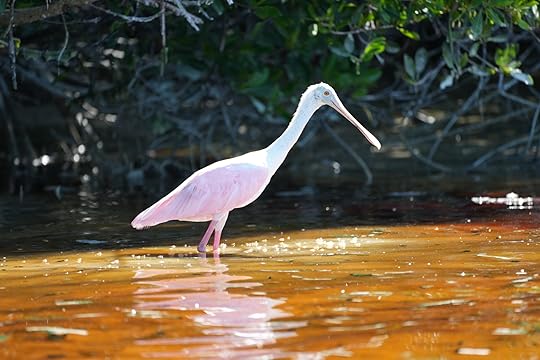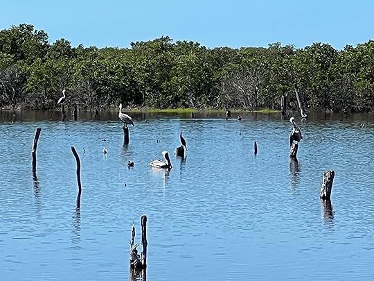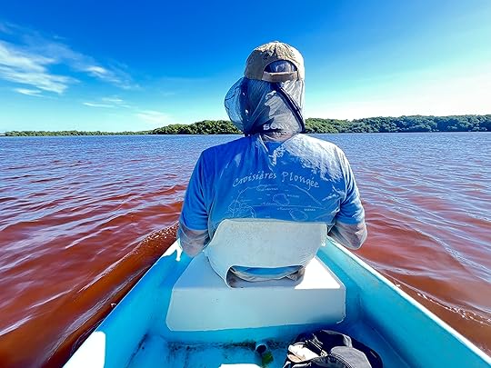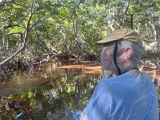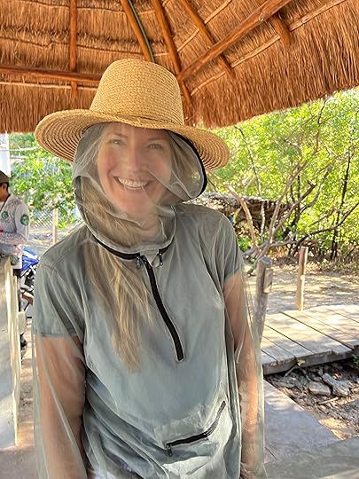 On Ross’s birthday we have booked a birdwatching tour in canoes in the mangrove swamps in Celestun, to be followed by a seafood lunch on the nearby beach. As soon as we arrive at the starting point for our trip with the original founders of the wildlife sanctuary, the Guardianes de los Manglares de Dzinintun, we are given all-enveloping anti-mosquito gear, including netted arms and face masks! And it is absolutely essential as they are pesky little nippers.