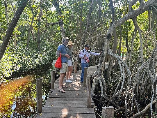 Our guide speaks good English and he is soon silently – save for the occasional splash of the punt-pole – easing us along through the creeks, in-between the tangled mangrove roots. It takes a while to get our eyes in but soon we are spotting herons of all types, kingfishers, a large black eagle, and even some baby crocs sunning themselves on the bank.