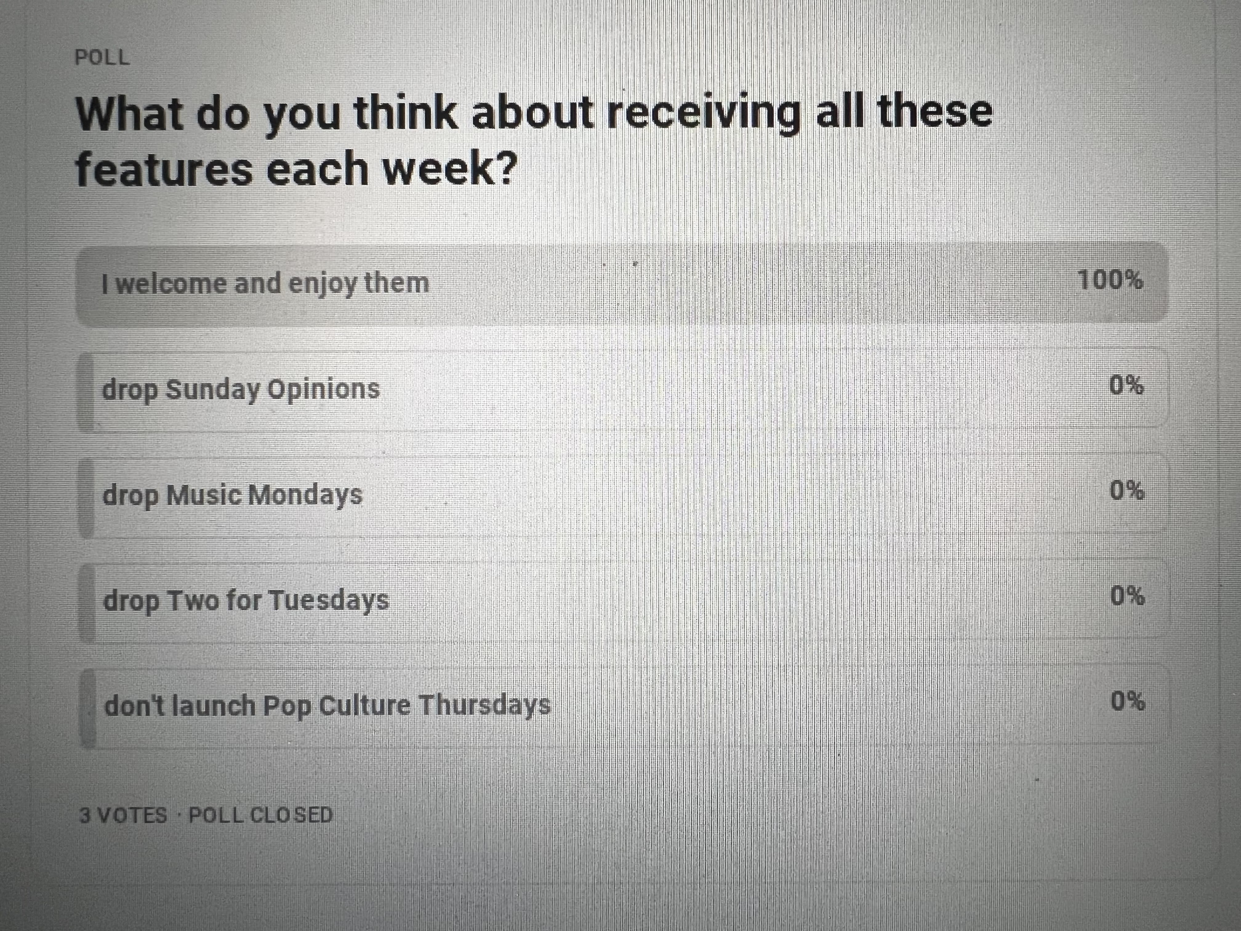 I hope this gets in front of any creator down on the value of their work; please do not sell yourself short. There are so many of us out here waiting and hoping and needing delivery from the challenges of 2025, and your work is what we need. Remember that you have people out here for who your work is a balm, an escape, a salvation from what we’re going though.