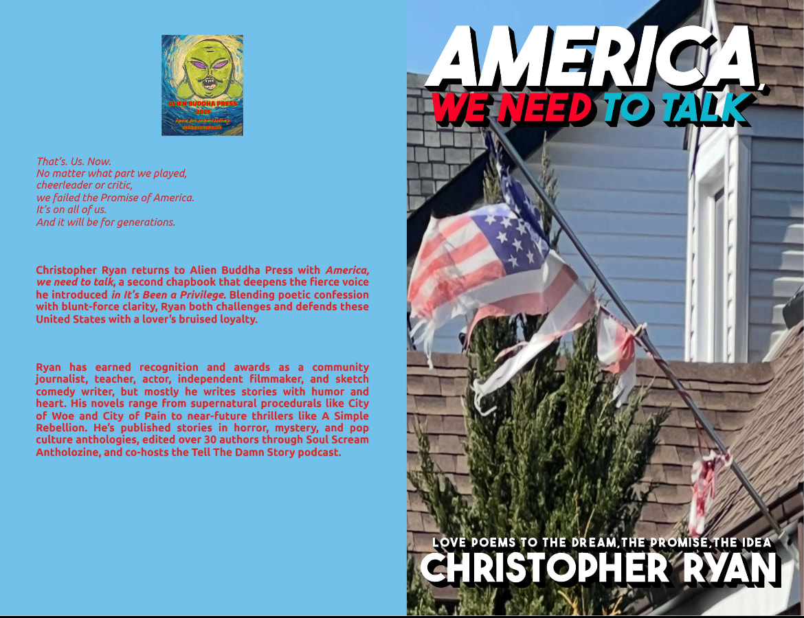 Some responding by doing more: workouts, drinking, reading, screaming, despairing, demonstrating, whatever helps one cope. None of that works for me. Instead, I write, edit, plan publishing projects. This week, while preparing the next Soul Scream Antholozine which will be subtitled (title reveal!) Fear and Loathing, which features horror tales more or less dealing with the aftermath of all the current changes going on, something else happened. The political and economic slashing and tearing at America itself sparked a second, more intimate set of writing. The result proved to be America, We Need to Talk, a collection of free verse poetry depicting a last date between a lover and the object of his love, America.