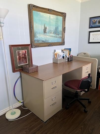 I’m super proud of what Bob has done. He really doesn’t have time, and it’s not something he likes to do, but he did it for me and means a lot. Neither desk was visible under the stacks prior to his hard work. My desk needs a bit more work, too, but I always have wood showing.