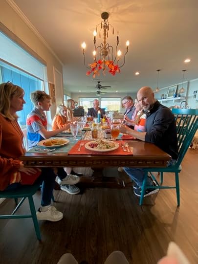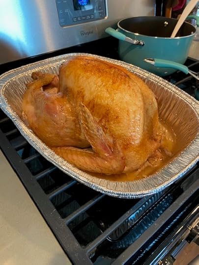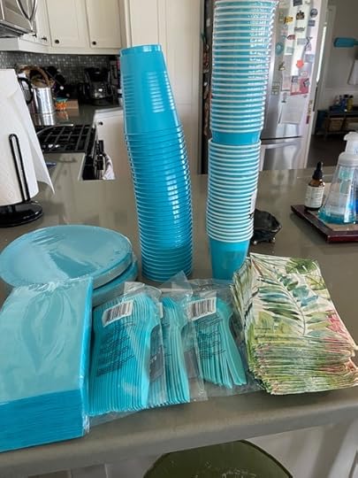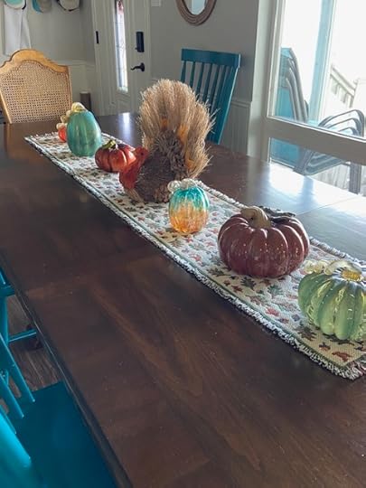We only host this group once a year. Sometimes I don’t have my fall decorations up yet, but this year I do. I wanted to find plates and napkins with fall leaves on them. While Halloween stuff is already out and some fall stuff is out, the napkins and plates are nowhere to be found, so I decided to go with surprise, surprise—turquoise. I did already have a bunch of turquoise iced tea cups so that made financial sense. However, I wouldn’t have used them if I’d found the leafy napkins. Maybe we’ll sign up to do this in October next year. But maybe not. Next year we’re going on a Fall trip to someplace in New England. The research has already begun and will be the subject of another post sometime.