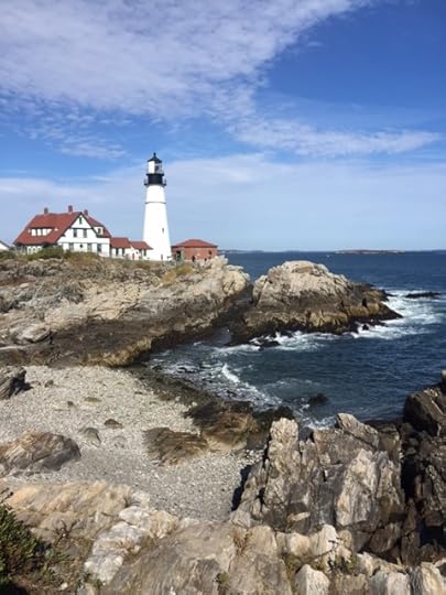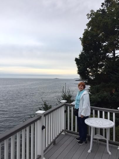 2010 L– Me on the balcony of the cottage in Boothbay Harbor, Maine. YOu might recogize a picture similar to this was used to make the cover of ACT OF TRUST. C–Maine Headlight in Portland. Also seen in my banner. R–Gorgeous tree (one of the reasons we go) in front of cafe where we saw little ladies playing Mah Jongg before I knew what that was. I used them in one of my books.