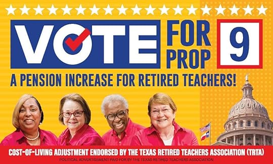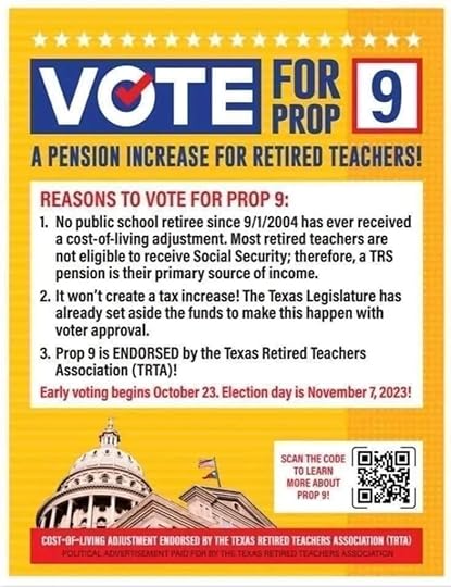 Lastly, for those of you in Texas, on November 7th, we vote on 14 Constitutional Amendments. (Other states have other kinds of elections taking place that day. Please make sure to educate yourself about the ballot and to make plans to vote.!) One Texas ammendment is particularly important to me and other retired teachers. It would provide a cost of living increase for the first time since 2004. This ammendment is supported by the Governor, House & Senate. So if you know anyone in Texas please share. If you’d like an explanation of each of those amendments, click here. Guide to the Nov. 7 Texas Constitutional Amendment Election – Texas Freedom Network (tfn.org)