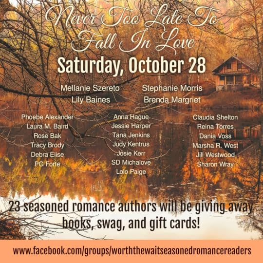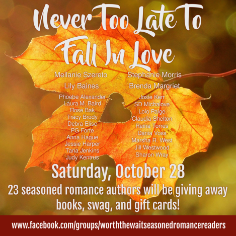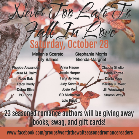 Here comes some really fun stuff. I’m inviting you to join me this coming Saturday, October 28, at the Never Too Late to Fall in Love Facebook Event. Lots of authors (all of seasoned romances), lots of giveaways including e & print books, Gift Cards, and other fun stuff. All you have to do is to join https://www.facebook.com/groups/worththewaitseasonedromancereaders/This is the simplest event. You join the group, and on Saturday, go to the group and you’ll see posts from the authors. You comment, and that gives you a chance to win. The more you comment the more you increase your chances of winning. The characters in the books are all over thirty. (You know I personally think seasoned characters need to be at least 40—the youngest age of any of my characters.) All the posts will tell you the age of the H & H.