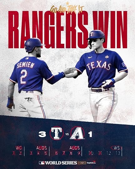 I swiped this pic from my friend Karen Landon on Facebook.This year they beat the Houston Astros to win the American League, and they’ve been playing the Arizona Rattlers. Neither team had been expected to make it this far, so that’s really cool. The Rangers have a 3-1 lead over Arizona… OMG! The Rangers won the World Series. It was the most exciting thing to watch. A real nailbiter right down to the end. They beat Arizona 5-0. GO RANGERS! WhoHoo!!!