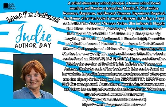 If you missed my September newsletter, here’s the link: https://mailchi.mp/b0646b3b4de1/september-2023-newsletter-marsha-r-west-author As always I’d love to hear from you.Blurbs for each of my books with links can be found on my website https://authormarsharwest.wordpress.com/ Where you can also sign up for my blog and my