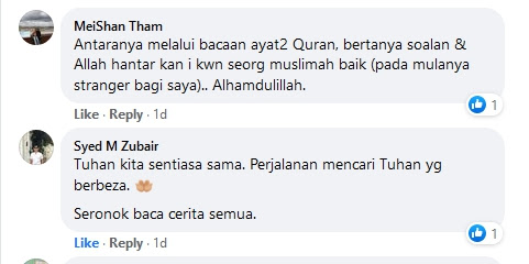 Adni KitTengIf it’s kenal Islam, sejak zaman sekolah melalui kawan2 Melayu. But betul2 memahami Islam, bermula di tempat kerja. Rakan sekerja buka Quran dan ceritakan tentang kejadian alam, syariat kita sebagai hamba di dunia dan dunia akhirat setiap pagi sebelum makan sarapan pagi. Then baru diri ni yang dulu benci sangat Islam sedar bahawa ciri2 Islam yang dibenci tu bukannya ajaran Islam yang sebenar. Silap diri ini anggap apa yang dipamerkan oleh orang Islam di sekeliling sebagai ajaran Islam berlandaskan al-Quran.Alhamdulillah sejak tu mula baca terjemahan al-Quran dan mula praktikkan ajaran Islam sebelum mengucap syahadah. Perbezaan yang sangat besar dirasai waktu belum Islam lagi tapi beranikan diri cuba bertudung dan menutup aurat gi kerja. Saya kerja dalam bidang muzik, bidang hiburan so maklumlah memang jarang orang jaga batas pergaulan. But masyaaAllah terkejutnya saya bila alami sendiri apa yang sehelai tudung di kepala boleh ubah! Majikan saya (yang merupakan seorang Muslim Melayu) biasanya akan sentuh-menyentuh dan memegang pinggul bila kami bincang tentang kerja, tapi pada hari pertama saya bertudung di tempat kerja, dia hulurkan tangan untuk berjabat tangan pun sendiri tarik balik tanpa saya perlu kata apa2. Aisya Humaira LeeMasa secondary school. Masa form 4.. perasaan mencari tu datang dari hati. Bermula dari ingin tahu. Until 1 day sya realize then sya start mencari ...... sya start beli buku2 ttg agama islam, tahun 2015 sya jumpa seorang lelaki melayu asal dari semenanjung duda dan ada anak. dia guide sya ttg agama sampai sya betul2 faham & mula sayang dengan Islam. Dia selalu bercetita tentang agama & nabi2, dia slalu cerita tentang pahala , tentang kebaikan, tentang hikmah. Until then, Finally sya revert pasa tahun 2017 dan selepas beberapa bulan sya revert dia lamar sya. Now kami dah ada 2 anak sendiri. Dan termasok anak dia sblom ni, kami ada 5 anak. Dan dia masih selalu bercerita tentang agama, nabi2 & hidayah, dia juga selalu pasangkan ceramah dari ustaz2 dengar bersama. Love by heart not love by DNA.