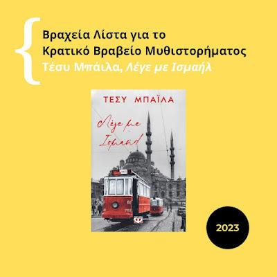Ανακοινώθηκαν στις 15.02.2024 οι Βραχείες λίστες για τα Κρατικά Βραβεία 2023.  Με πολλή χαρά είδα ότι το ΛΕΓΕ ΜΕ ΙΣΜΑΗΛ είναι υποψήφιο για το Κρατικό Βραβείο Μυθιστορήματος του 2022. Ευχαριστώ θερμά την κριτική επιτροπή που το επέλεξε στη Βραχεία λίστα.