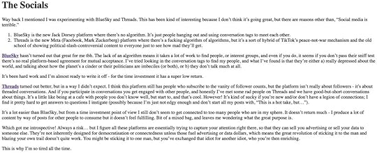 Last year I heard the new social media platforms were better, in a vague and unspecified way, so I wrangled myself an invite to the then invite-only Bluesky, and hopped on Threads. I posted and engaged with both a reasonable amount (more on Threads, though) over a chunk o’ time. A month or so ago, I sent this to my mailing list fans:
