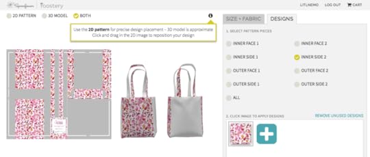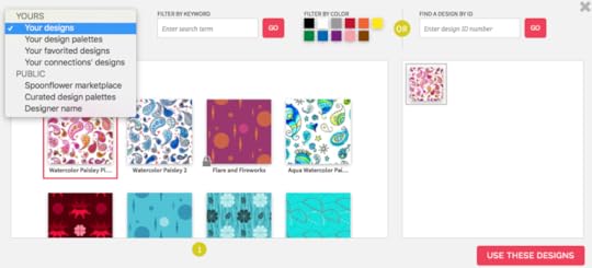 Looking through my designs, I chose my newest one, Watercolor Pink Paisley. At Sprout, I chose the Everyday Tote pattern, and clicked the “Create Your Own” button. To select a design, click the turquoise button with the plus and choose the design you like. You don’t have to create your own design if you don’t want to; you can search throughout the entire Spoonflower marketplace, or the designs you’ve marked as favorites, or designers you follow.