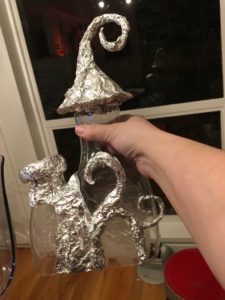If you want to have features that look like stems or vines, as I did, use craft wire to create an armature for each structure, then mold foil around the armatures. Again, glue these to the bottles.