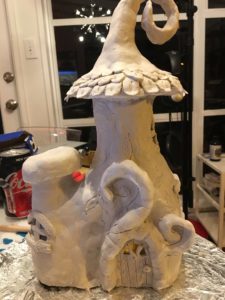 Now, it’s clay time! Get out your air-hardening clay. Roll out pieces of clay, wet your hands down well, and start smoothing the clay onto the structures you’ve created. Keep your hands wet and the surface of the clay wet to smooth it down. Cover the foil structures you have made.