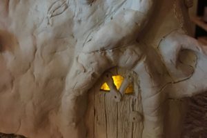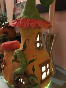 The best thing about it is that it is solar-powered! At night, the houses light up, one by one as the “fairies” arrive home. There are also some “street lights” (actually solar path lights).