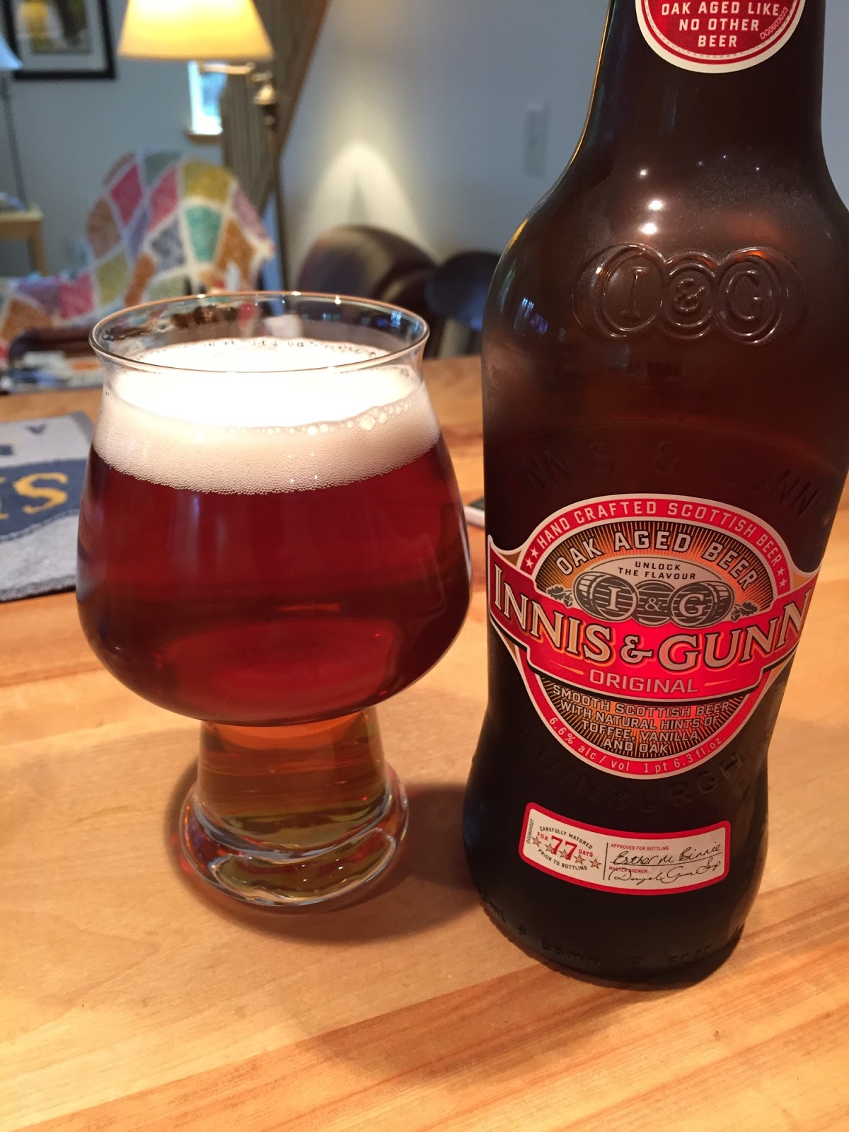 Innis & Gunn's Original Ale: This Scottish ale poured a clear copper color with a small, off-white head. The nose had notes of caramel and hints of oak. Mouthfeel was medium and the carbonation was good. On the palate, I picked up sweet notes of toffee and caramel, but there was enough hop bitterness to balance, followed by hints of oak. A very nice beer made even more complex with the addition of the oak-aging. 6.6% ABV.