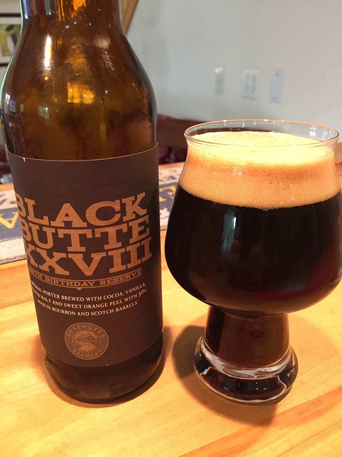 Deschutes Brewing's Black Butte XXVIII: This beer was bottled on 6/13/2016. It poured completely opaque with a nice, persistent tan head. The nose was of cocoa, oak, and whiskey. Carbonation was good, and the mouthfeel was medium. The flavor profile was rich and thick, almost oily; there were coffee and chocolate notes, hints of molasses, with a bit of alcoholic warmth on the finish. Another excellent beer in this classic annual series. Delicious! 11.5% ABV, 51 IBUs.