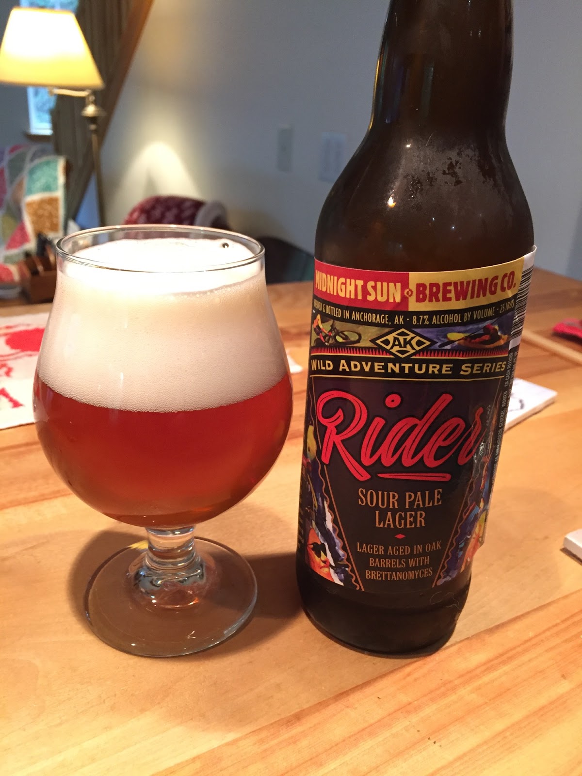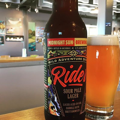 Midnight Sun Brewing's Rider Sour Pale Lager: It poured a deep, slightly hazy gold with a wonderful off-white head. The nose had hints of brett funk, as well as a little oak, but nothing overwhelming. The carbonation was excellent and the mouthfeel was light. The flavor profile began with clean lager notes, followed by some brett tart funk, then oaky notes on the finish. This beer will not be everyone's cup of tea, but I loved it! I applaud Midnight Sun for being willing to try something as different and experimental as this (as opposed to just pumping out another new IPA variant). Great job, and I'm eager to try the next beer in the Wild Adventures series! 8.7% ABV, 25 IBUs.