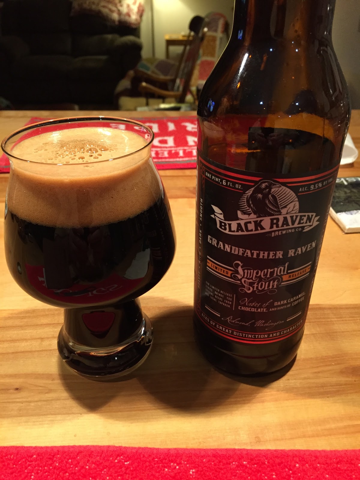 Black Raven Brewing's Grandfather Raven Russian Imperial Stout: Another impressive brew from the award-winning Washington brewery. It poured opaque with a nice mocha-colored head. The aroma was full of coffee notes with hints of chocolate as well. Carbonation was excellent and the mouthfeel was medium plus. The initial flavor profile was smooth roasted flavors, very rich and complex, then more hints of chocolate sweetness followed by a long, lingering finish. A superb Russian Imperial Stout. 9.5% ABV, 70 IBUs.