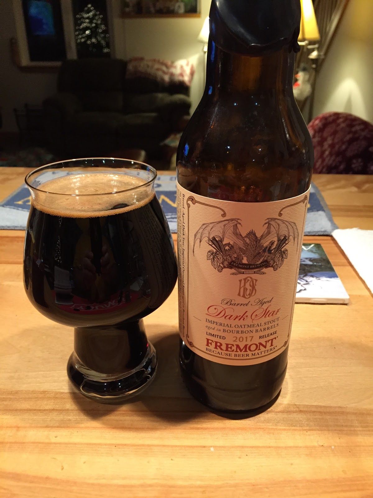 Fremont Brewing's Barrel-aged Dark Star Imperial Oatmeal Sout (2017 ): The dark beauty had spent a year in my cellar prior to my opening it. It poured dark with a decent tan head that dissipated to a collar. The nose spoke strongly of its time in bourbon barrels. Carbonation was on the low side but acceptable, and its mouthfeel was very oily and smooth from the use of oats. On the palate, it was rich and think, with plenty of roasted flavors and additional bourbon notes, falling away to a touch of alcohol heat on the finish.14% ABV, 50 IBUs.