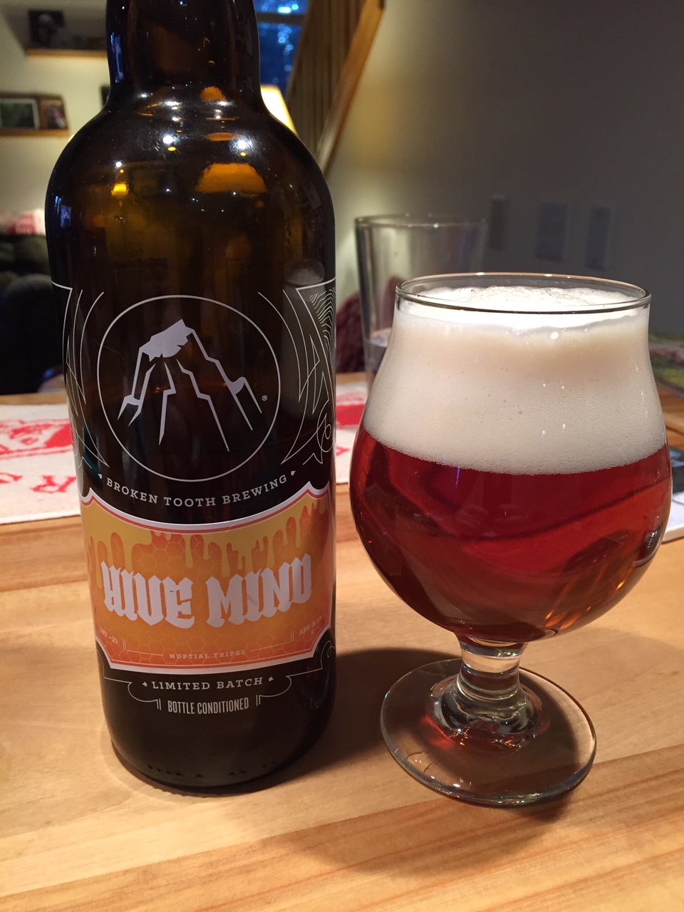 Broken Tooth Brewing's Hive Mind Tripel: This limited release poured a clear copper color with a dense, off-white head. The aroma had the spicy, peppery notes you'd expect from a Belgian yeast. Mouthfeel was light thanks to the use of honey, and the carbonation was excellent. On the palate there were nice fruity notes; overall, the flavor was excellent. A delicious tripel from Broken Tooth! 9.5% ABV, 21 IBUs.