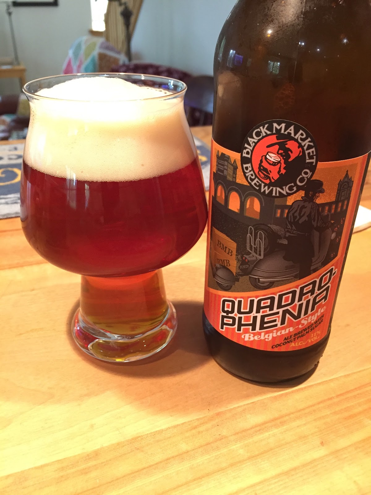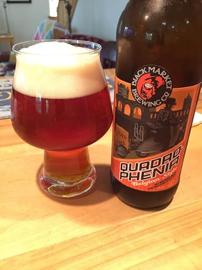 Black Market Brewing's Quadrophenia: A Belgian Quad brewed with coconut palm sugar, this beer poured a deep red-gold in color with a nice cream-colored head. The nose had a subtle fruit odor, difficult to identify; I finally settled on apricot, but your mileage may vary. The mouthfeel was light to medium and the carbonation was excellent. On the palate, there was considerable sweet notes, both of fruit and caramel, followed by alcohol warmth on the finish. Unlike most Belgian quads, which seem to favor dark fruits (plums, figs, raisins) in their flavor profiles, this one seemed to recall lighter fruits (peaches, pears). Overall, I found it to be quite enjoyable. 11% ABV, 29 IBUs.
