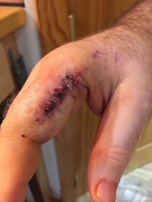 Hello! It's been quite some time since I got one of these blog posts up; more than a month, in fact, which is a long time, even for me. For those of you who have been wondering, let me tell you what happened. In early September, I had some minor surgery on my right hand. After several months of going back and forth with the Veterans Administration, I finally got in to see a hand surgeon, who did an MRI and then told me I had a tumor on a tendon in my right forefinger. It was benign (fortunately), but it had to come out. After the surgery, here's what my finger looked like: