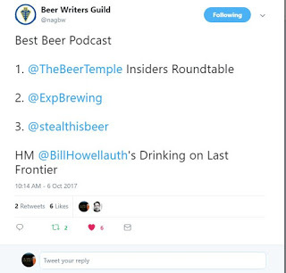 By the way, my radio show received an Honorable Mention in the Broadcast/Podcast Category of the 2017 North American Guild of Beer Writers Awards . Winners were announced on Friday, October 6th, at the Great American Beer Festival in Denver. You can see a complete list of this year's awards here. So if you haven't listened to it yet, you might want to check it out.