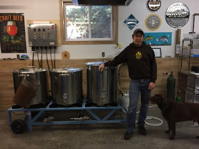 Nelz Barnett and Assitant Brewer Charlie next to his brewing system.Cooper Landing's beers are on sale in crowlers at