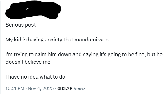 My kid is having anxiety that mandami won.