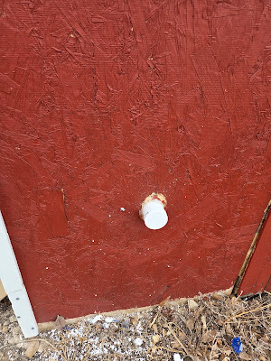 In theory, it was a good idea. In practice, well, it would have been a great idea if I'd drilled my pilot hole exactly parallel to the ground, but I failed to do so. I drilled the first hole from the outside of the building to the inside, as far as I could, then I handed off the drill to Jay to drill from the inside to the outside.