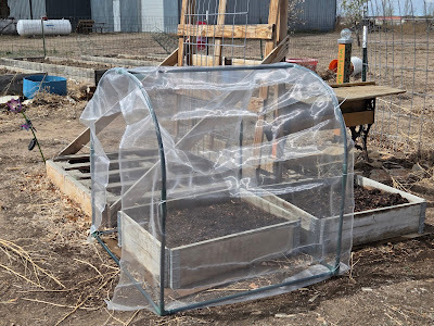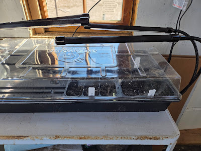 Sorry, I'll get back on track. I built Maggie as a potting shed, to house the amazing potting bench that L.E. gifted me. At the beginning of March, the Bionic Cowgirl and I put that potting bench to work starting seeds. Last year, and the year before, our seed starting didn't go very well, so I was determined to be successful this year. I bought trays with domes, fancy organic starting soil, and grow lights. I plugged in an oil heater and put it on a timer, so the temps wouldn't drop overnight. Our seeds are more spoiled than any other being on our place, they'd better grow!
