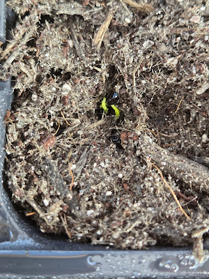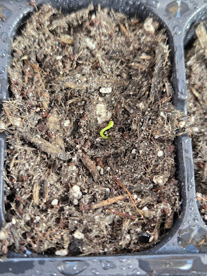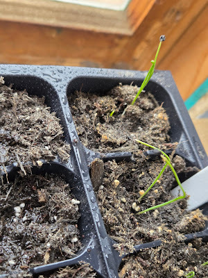 Mom and I had a good day's work that afternoon. The following Sunday, we headed to Moab for the sentencing, so Sunday dinner looked a little different. It was late when I got home on Monday, so I waited until Tuesday morning to go check on our seeds. The leeks were supposed to emerge at about ten days, and they did!