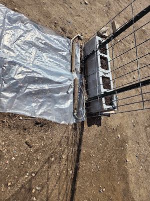 This chicken tractor frame has been so useful!My gothic garden has to go in in stages, but I did get to plant the poppies. And, under Maggie's new sweet pea trellis, I planted some creeping thyme seeds. Those seeds are so microscopic that I was afraid they'd blow away, so I covered them with greenhouse plastic and weighed them down with heavy old window anchors.