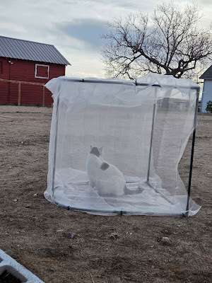 AnyTMI, I eventually began knocking things off the list. One of the things that needed to be completed was to finish the insect netting for my broccolini bed and get the drip line installed. Of course, that took much longer than anticipated (don't all "quick" projects take longer than anticipated?), but with the help of my cat scanner, Pongo, I was able to get it completed.