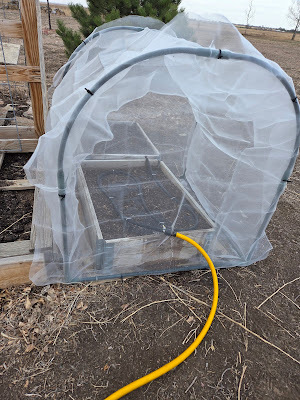 I'm attempting to grow broccolini this year. It's one of my favorite veggies, and it never occurred to me to try to grow it until I saw an ad for seeds. They were stupid expensive as far as seeds go (over $5 for 20 seeds), so they'd better grow! L.E. warned me that members of the broccoli family are prone to pests, so I decided to cover our old chicken tractor with insect mesh to protect the broccolini. I didn't have quite enough netting to completely cover it, so I ordered more. The broccolini will be protected before they begin to sprout. Additionally, I read that onions are a good pest deterrent and companion plant, so I put some onion in with the broccolini.