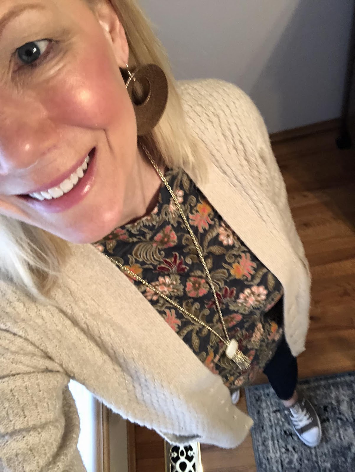 I paired the tee with a burgundy sweater and it looks great because of the colors of flowers in it. You can find a similar long cardigan here.