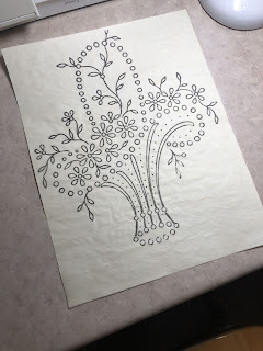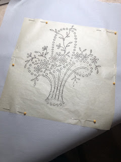 Remove the printed pattern from the freezer paper and baste it to the fabric you using to embroider your basket of flowers!