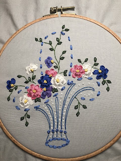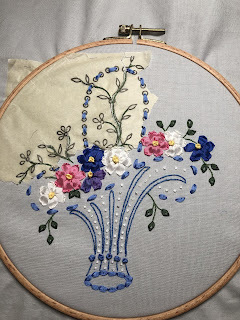 I decided to leave the silk ribbon French knots just above the base of the basket and replace the bottom ones with back stitch done with the same silk ribbon. I then started added flowers to the basket using 7mm silk ribbon and doing a ribbon stitch. The stems of the greenery were started using a stem stitch. Lazy daisy flowers were added to the stem stitch. Notice that I am removing the trace paper as I finish places on the basket.