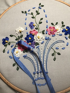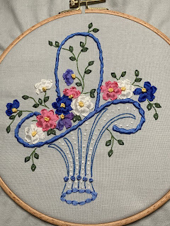 I continued to add the flowers in the basket using 7mm silk ribbon and a ribbon stitch. I then added colonial knots to the center of all of the flowers. I decided to replace the lazy daisies leaves on the stems. I had originally done them with thread, but I decided that the 2mm silk ribbon leaves would show up a little better. I also added straight stitches around the top of the basket, just below the flowers.