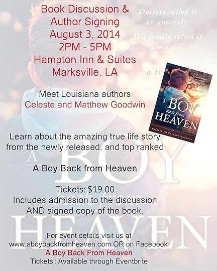 We are coming to CENLA! Join us in Marksville, LA for an afternoon of inspiration. The reader event starts at 2PM and will include a personal discussion of the events from A Boy Back from Heaven. It will be followed by a book signing. Each ticket will include admission to the discussion AND a signed copy of the book. We are excited to meet readers from Central Louisiana and share this powerful story. All tickets are advance purchase only. No tickets will be sold at the door.Link to purchase tickets: http://www.eventbrite.com/e/in-depth-book-discussion-author-signing-of-a-boy-back-from-heaven-tickets-12298845177