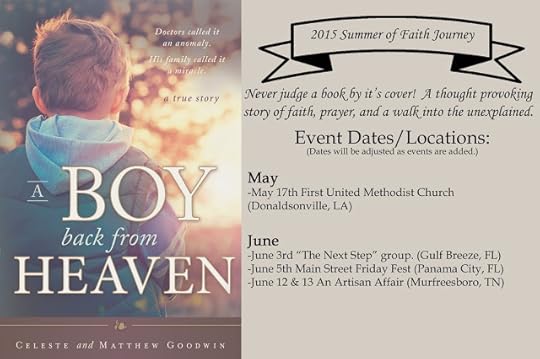 ONLINE event! Meet authors Celeste and Matthew Goodwin in a one on one session and ask them all the questions you have about his amazing story. Ticket price includes a signed copy of A Boy Back from Heaven. To get all of the event details please use the link to Eventbrite. We are looking forward to meeting readers and answering all of your questions. There are a limited number of tickets available and are first come, first served.Follow this link for event details: