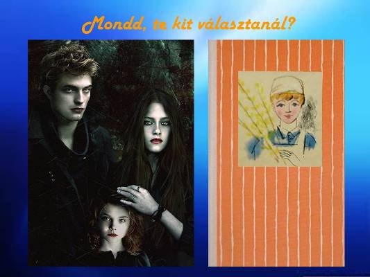 2/ Kötelező olvasmányok - lerágott csont, avagy sarkalatos pont? No, erre így nem tudnék válaszolni. Azt hiszem, egy kicsit mindkettő. Az biztos, hogy sokkal nagyobb hűhót csapnak körülötte, mint érdemes lenne. Szerény véleményem szerint ez az a gumicsont, amivel az ember gyermeke fölöslegesen megkeseríti a saját életét, és a felnőttek szorgosan asszisztálnak is ehhez, nehogy jobb legyen mán a kölöknek, mint neki vót. :D És itt nem csak az olvasmányokról vagyon szó. A „kötelező” szót felruháztuk egyfajta plusszal, amire hivatkozva aztán remekül rongálhatjuk a saját kedvünket.Nekem azt hiszem, szerencsém volt, a gyerekkoromból valahogy kimaradt az „utálom, mert kötelező”. Többnyire szerettem a kötelezőket, és ma sem feltétlen okoz gondot, hogy hétfőn dolgozni kell menni. Nem győzök csodálkozni, amikor látom, a facén, hogy hergelik bele magukat az emberek abba, nehogy hétfőn véletlenül jól érezzék magukat. Igaz, én sem vagyok különb az Deákné vásznánál, hisz a „nehogy kilógjak a sorból” késztetésnek engedve nem nagyon merek repkedni a tanáriban, s hajlamos vagyok kevésbé pozitív kijelentésekre ragadtatni magam (különösen az örök és soha el nem múló 7.bés órák után:))) - Szerinted cserére szorulnak a kötelezők? Mit cserélnél, mit hagynál meg? Igen és nem.Amikor beviszek az órára egy Boney M, Abba vagy Beatles számot, azzal szoktam indokolni, hogy amit szeret a gyerek, úgyis hallgatja feszt, de ezt nem is ismerné, ha én nem „kényszeríteném” rá. És innen a dilemmám: a kötelezők – ha már kellenek – cserére szorulnak, de hol, honnan ismerje meg a gyerek a klasszikus irodalmat, ha már a suli sem foglalkozik vele.Én szeretem Jókait, de el tudom képzelni, egy olvasni nem szerető – gyakran nem is tudó – kamasznak kész kínszenvedés végigrágni magát akár rövidített változaton is. Egy Légy jó mindhaláligról nem is beszélve… mellesleg egyiket sem gyermekeknek írták.Szerintem az egész „kötelező olvasmány” mizériát új alapokra kellene helyezni. Először is nem ártana, az életkori sajátosságoknak megfelelő művek közül válogatnának a kedves hozzá nem értők – talán kérhetnék a gyakorló és arra nyitott pedagógusok véleményét –, meghagynám a klasszikusokat „felturbózott”, gyerekhez közeli változatban (pl. az Oxfornak, Cambridge-nek milyen jó könnyített olvasmányai vannak). Ha a gyerek szeret olvasni, és megtetszik neki a könyv, később – amikor már érett rá –, úgyis el fogja olvasni az eredetit, aki meg utál olvasni, azt meg hiába gyötörjük, csak még jobban megutálja az egészet. S persze aktualizálnék, igenis válogatnék a kortárs művekből. Mindegy az, hogy a Harry Potter veretes (nagybötűs) irodalom-e, vagy Isten ellen való vétek, esetleg sima ponyva… népszerű, rengeteg gyerek szerette meg általa az olvasást. Miért ne adhatnánk a gyerek kezébe olyan könyvet, ami könnyed, olvasmányos (horribile dictu, még humoros is), és némelyek csak újságpapírba kötve merik olvasni a buszon, nehogy megszólják őket? Otthon a szülő, a suliban tanár feladata, hogy megláttassa a gyerekkel az értékeket, a szépségeket, megtanítsa, hogy nem tetszhet mindenkinek ugyanaz, hogy tisztelje a másik véleményét és ízlését, stb. Hiszem, hogy nincs jó meg rossz könyv, mert az, amitől én esetleg falnak megyek vagy a hajam tépem, valaki másnak a legkedvencebb kedvence. Ettől ő jobb vagy rosszabb lenne, mint én? Nem hiszem. - Volt olyan kötelező, amit nem olvastál el soha? Illés Gyula: Puszták népe (Ez már szinte közmondásos a barátnőm és köztem, mert ő végigkínlódta magát rajta, és erre roppant büszke, ha szóba kerül, sosem mulasztja el, hogy megemlítse:) - Vagy amiért igazán rugdosni kellett a szülőknek, naponta beosztani az oldalakat például? Nem. Imádtam olvasni. Inkább azért kellett rugdosni, hogy ne olvassak már állandóan. - Melyik kötelezőt szeretted meg igazán, melyik maradt jó emlék? A kőszívű ember fiaiig mindet szerettem (a suli óta is többször újraolvastam őket), Jókain azonban simán elaludtam. Főiskolás voltam már, amikor rákaptam a műveire, de akkor le sem tudtam tenni őket (tudom, cica nyekk:).