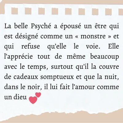 Cette nuit-là, quand il s’est endormi, elle l’éclaire de la lampe à huile qu’elle avait jusque-là tenue cachée. Elle voit alors le plus beau jeune homme du monde, le dieu même de l’Amour. Elle se met à le couvrir d’abord de baisers, tout endormi qu’il est, puis à caresser ses flèches avec passion. C’est alors qu’elle se pique à l’une d’elles. C’est à ce moment-là, précise le texte d’Apulée, qu’elle se met à l’aimer… 💘