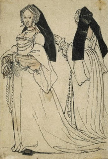 "Draughty today, isn't it?" (Sketch by Hans Holbein the Younger. British Museum.)The kirtle or foreskirt went over any undergarments, such as a shift, or what we might call a full-length 'slip' today. The kirtle often had a plain back and a highly decorative front panel, especially if the lady's family was wealthy and she wished to demonstrate that with fine and expensive materials. Sometimes the kirtle was already attached to a bodice, but might also be laced into place at the time. The more wealthy the woman, the more complex these laced-on-accessories could be. After all, a well-born lady would have numerous maids to help her get dressed - and undressed again later.
