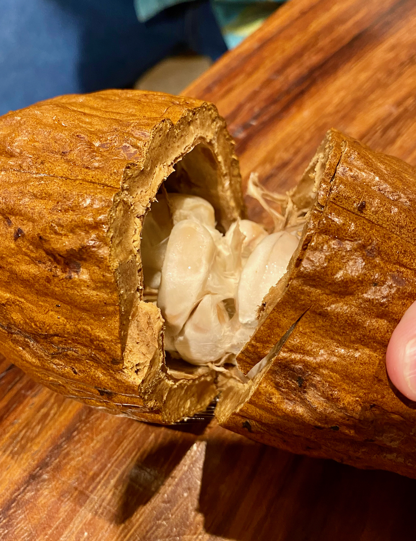 Pod from the cacao tree with cacao beansOf all the things I’ve learned in my life, learning to make chocolate from cacao beans has been one of the most gratifying. Give someone a piece of chocolate and feed them for a day. Teach someone to make chocolate, and feed their soul for a lifetime.