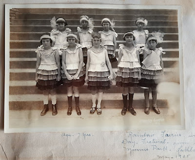 "Rainbow Fairies" It's 1925 and my mother is seven. She's the tall one second from the right --- and I've unearthed yet another scrapbook in my workroom cleanup. My grandmother was a meticulous recorder, and I'm enjoying this look at my mother's past.