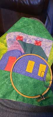 Now I'm working on a House block which I evidently had intended to embellish with embroidery. So out comes the long diused embroidery thread and hoop.