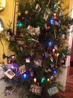 Now that resonated with me, and apparently with her too, for much to my amazement, when we entered her house last evening, along with her usual “Martha Stewart” décor, in the butler’s pantry stood a Charlie Brown Christmas Tree. On it attached with paper clips were family Christmas photos from years past. She was just getting started, but already had enough photos that her Dad and I spent half an hour looking and remembering. It is in no way gorgeous like her other tree, or like her trees from years past, but let me tell you, we spent far more time looking at it than we have at any other.
