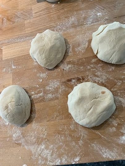 Dissolve yeast into warm water in a bowl and let sit for twominutes. Mix in rest of ingredients. Mix and knead for 4-5 minutes on a flouredsurface until solid ball takes shape. Cut into 4 different slices and rollthese into balls. Put two in the refrigerator for tomorrow night and two in thefreezer for next week.
