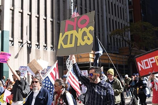 A man holds up a sign that reads “No Kings” as demonstrators walk down 15th Street in downtown Denver during the “No Kings” protest on Oct. 18, 2025. Michael Braithwaite, The Denver Gazette)